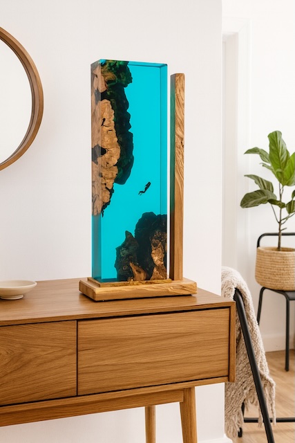 Depuis Minorque, nous créons des sculptures, des lampes et des pièces décoratives uniques qui associent bois naturel et résine époxy pour capturer l’essence de la mer.